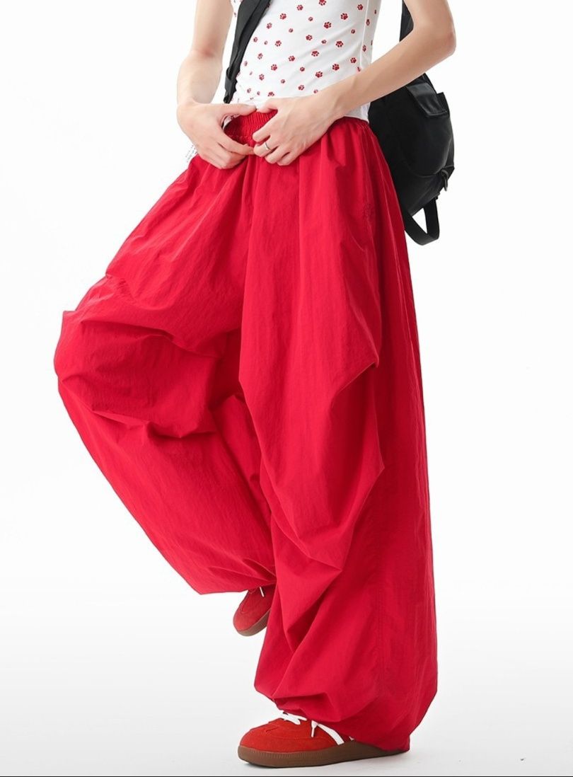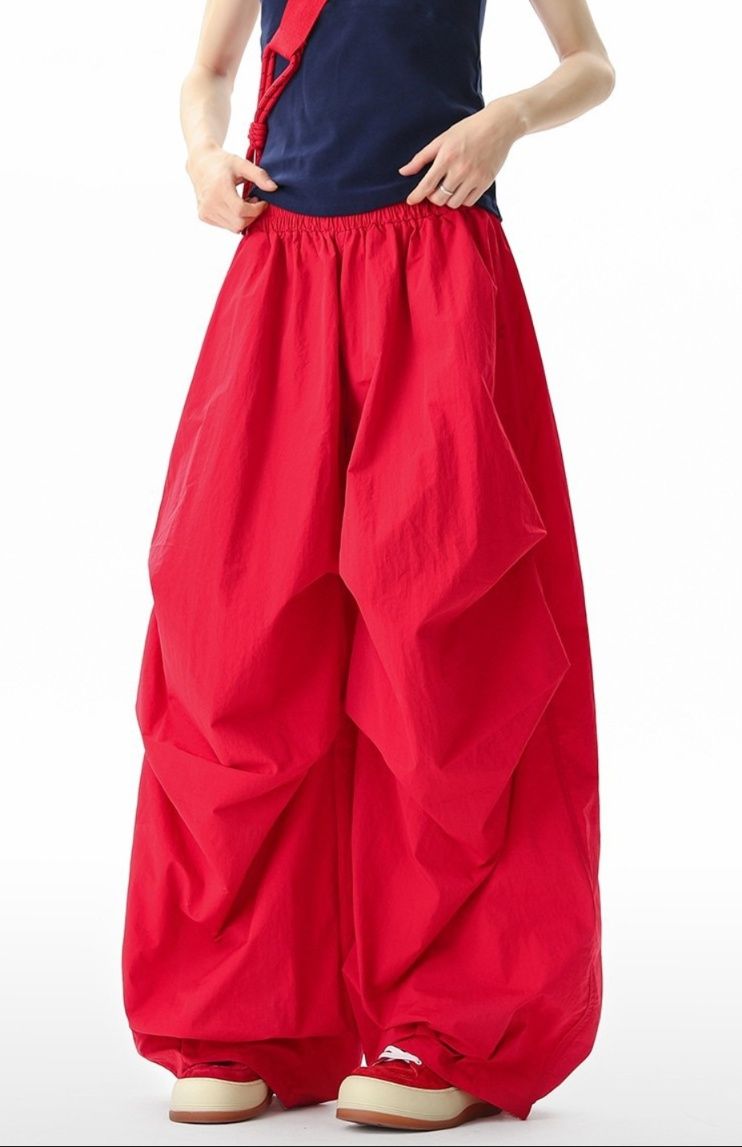 赤コーデに個性と存在感をプラスする、アート感覚あふれるパンツです。