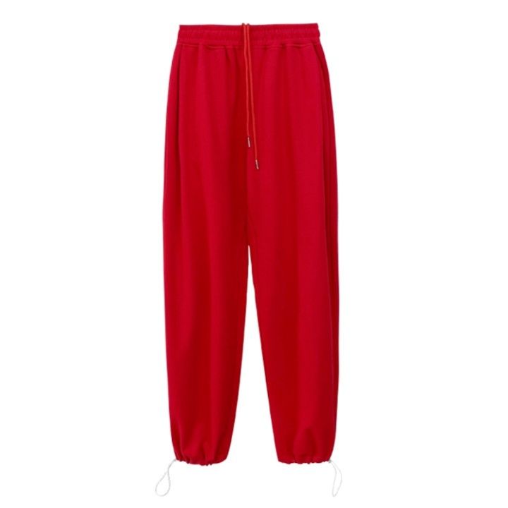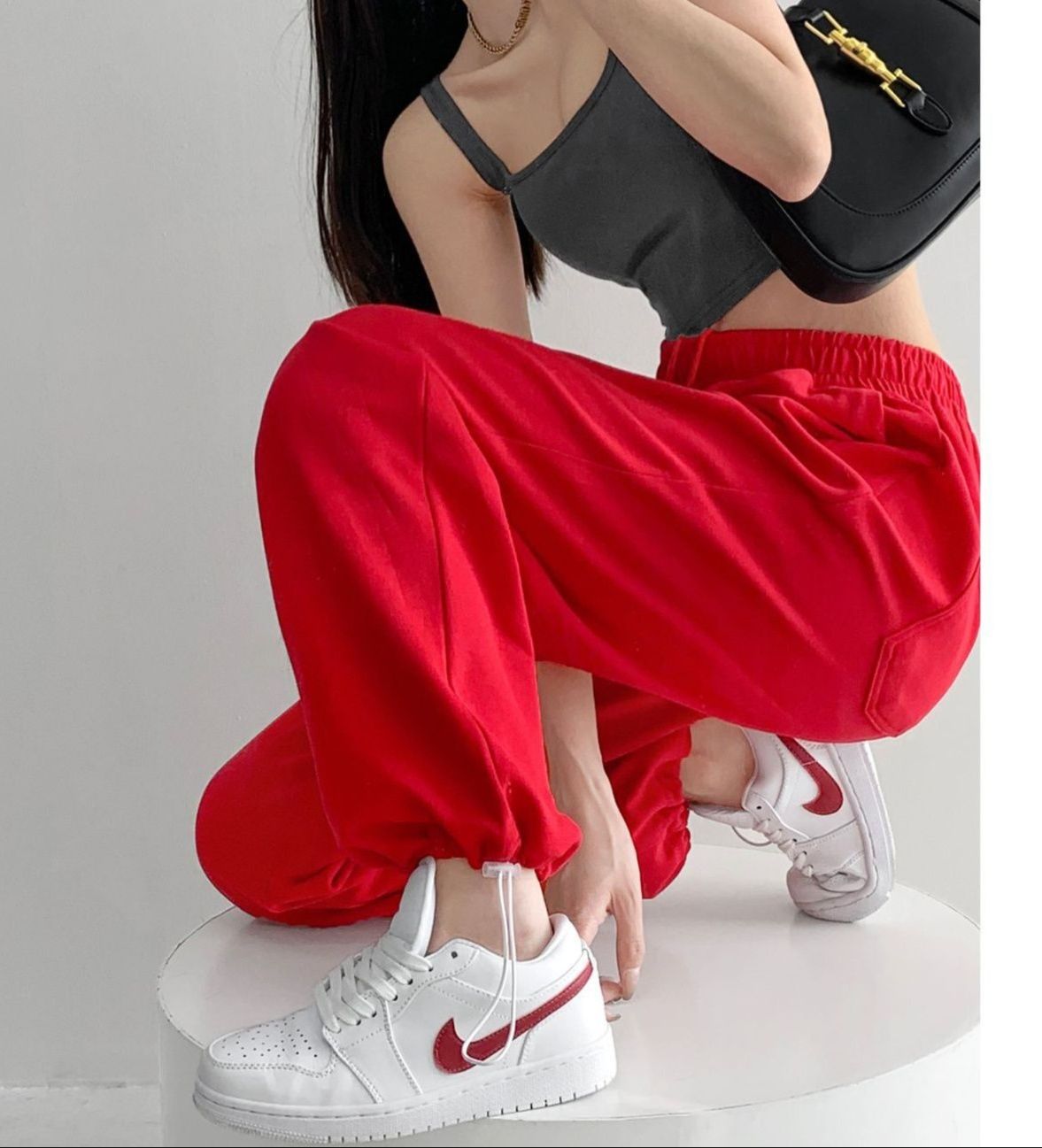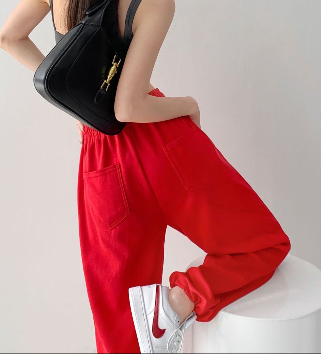 赤コーデに映える裏起毛仕様のスウェットパンツです。