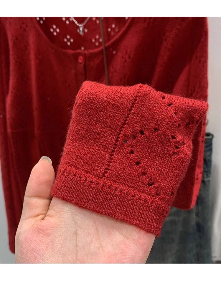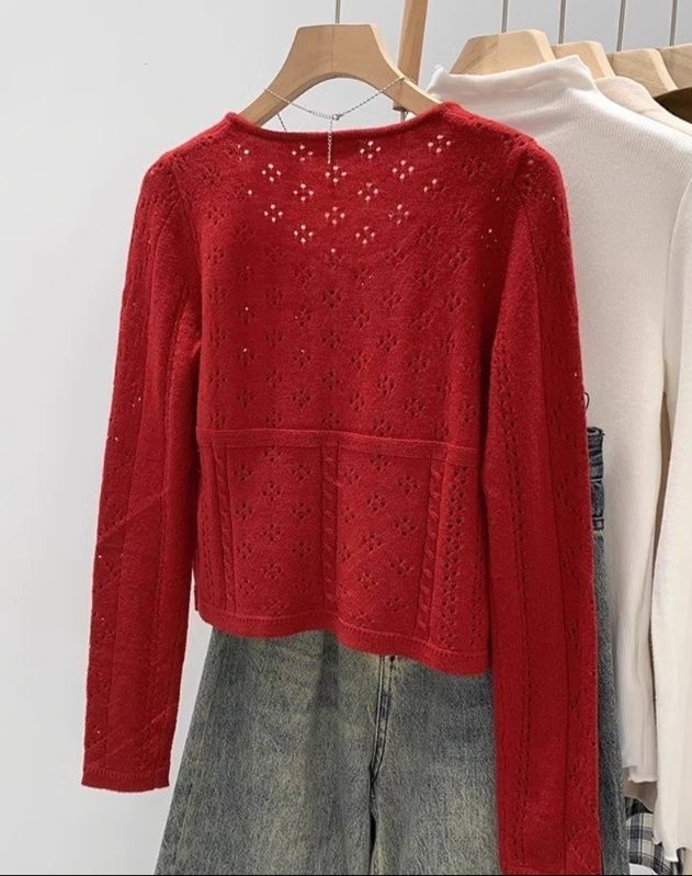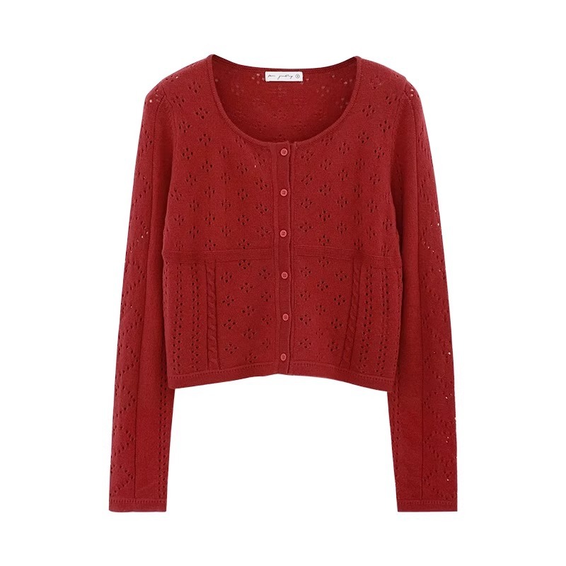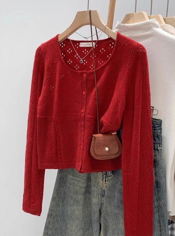 丸襟のデザインが優しく女性らしい印象を演出し、赤コーデに華やかさをプラスします。