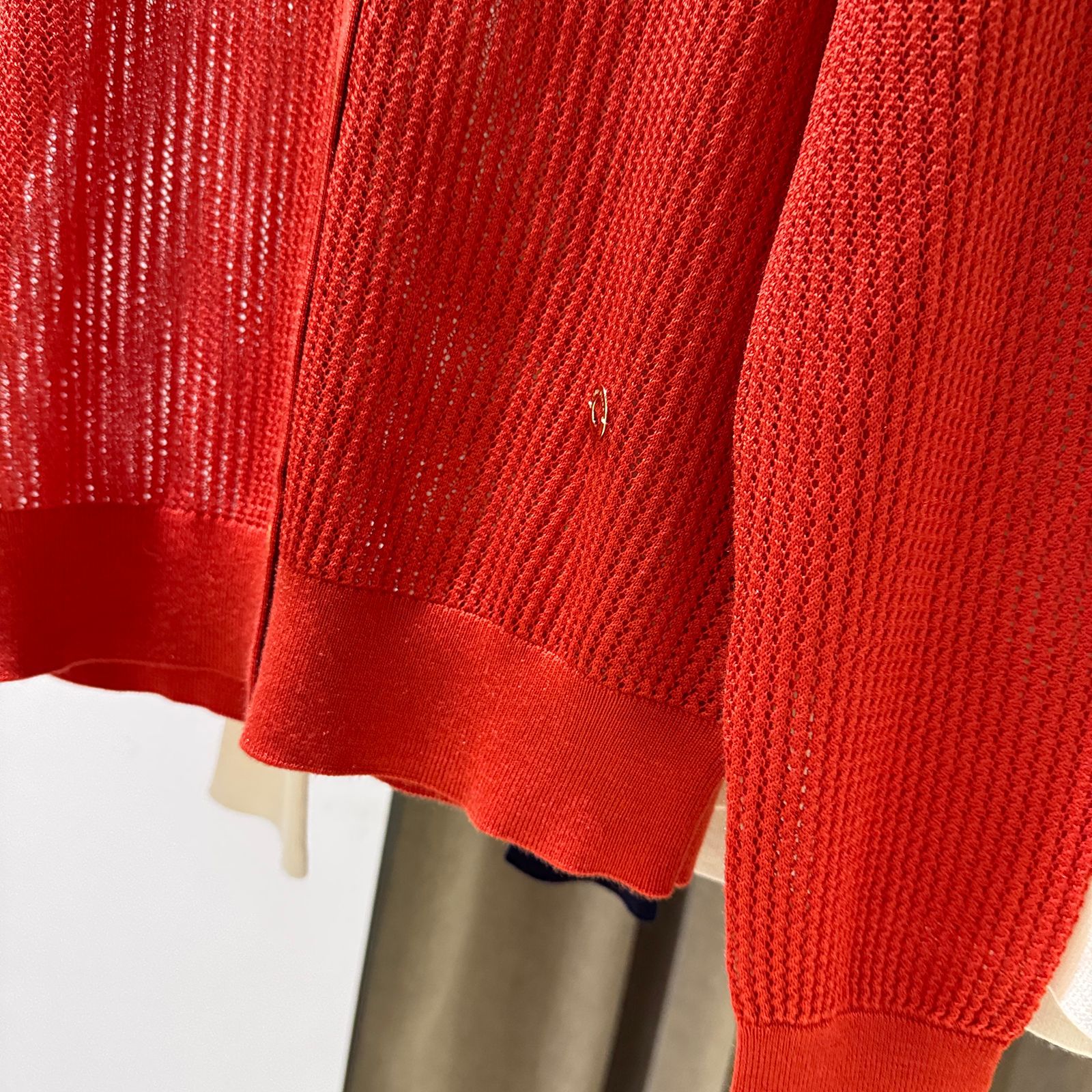 繊細な透かし編みが魅力的なニット素材のカーディガンです。
